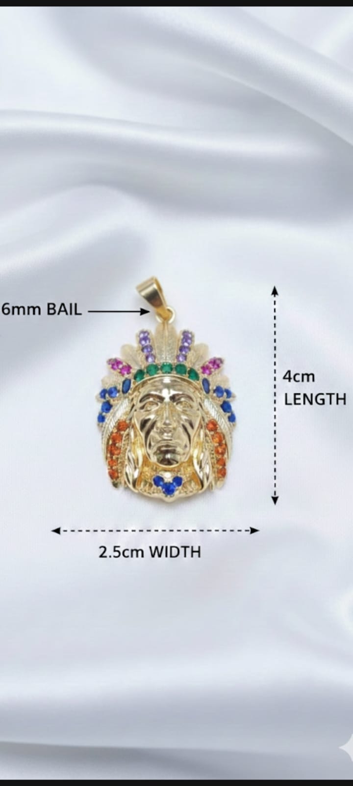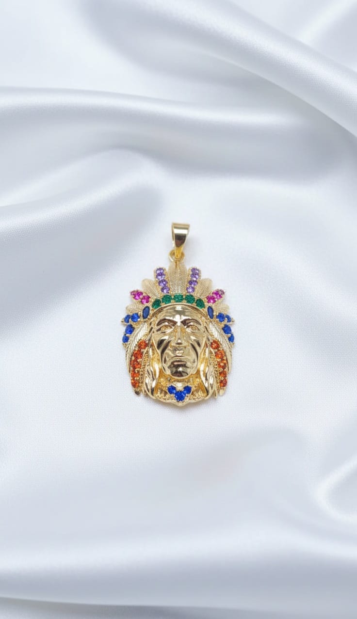 Un gioiello audace che celebra la forza e la cultura ancestrale. Questo dettagliato Ciondolo Capo Guerriero raffigura il profilo di un capo guerriero indigeno, realizzato in pregiato Oro laminato. Il maestoso copricapo di piume è finemente decorato con una selezione di cristalli multicolore (viola, verde, rosso, blu e arancio) che donano vivacità e carattere al pezzo. La finitura lucida del volto crea un contrasto perfetto con la brillantezza delle pietre, rendendolo un accessorio unico per chi desidera distinguersi con uno stile etnico e lussuoso.