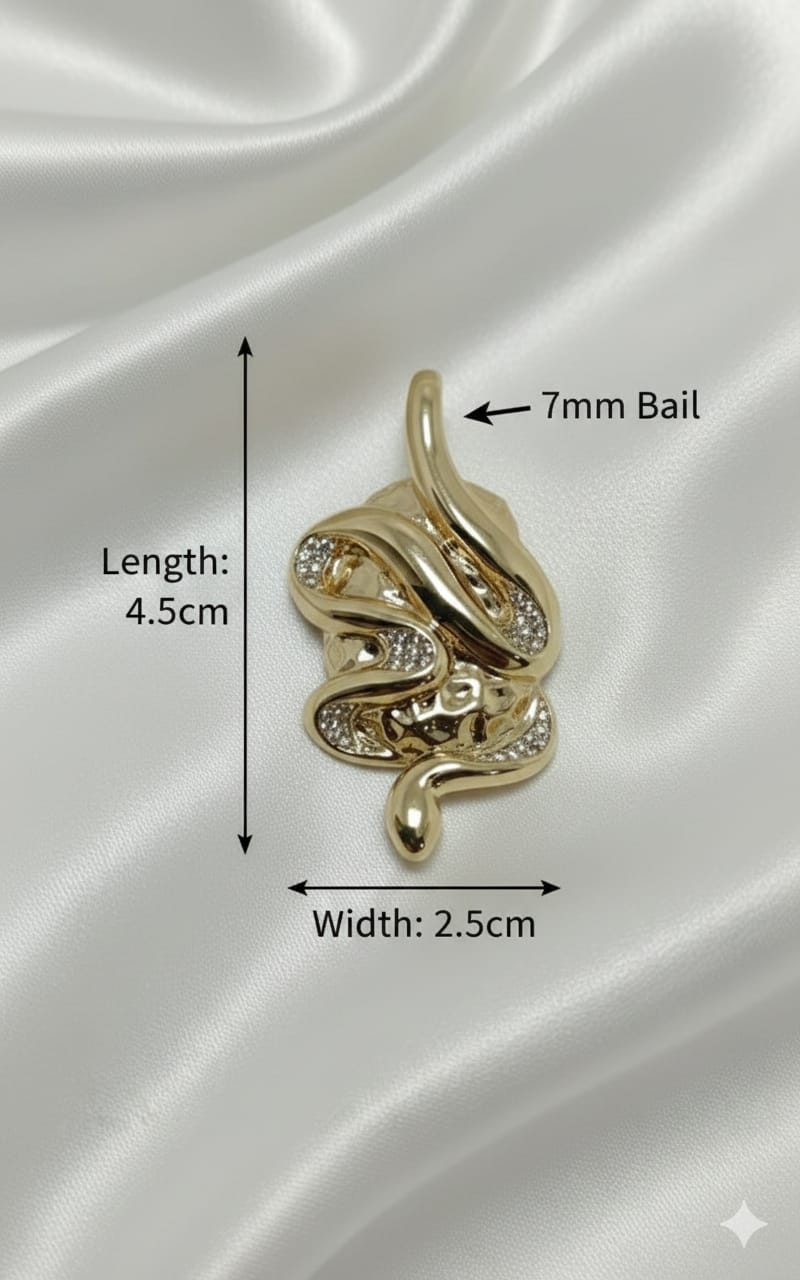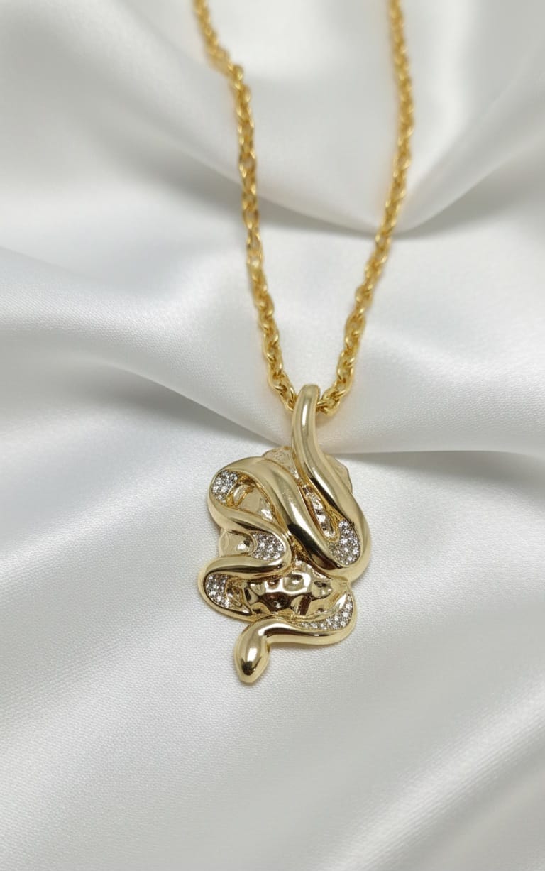 Un gioiello audace e magnetico che incarna il simbolismo della rinascita e della saggezza. Questo pendente presenta un design a serpente sinuosamente intrecciato, caratterizzato da un’alternanza impeccabile tra superfici in oro laminato liscio a specchio e sezioni impreziosite da un pavé di zirconi brillanti incastonati a mano. La sua struttura tridimensionale e la lucentezza lussuosa lo rendono un accessorio “statement”, perfetto per chi desidera distinguersi con un look audace ma estremamente raffinato.