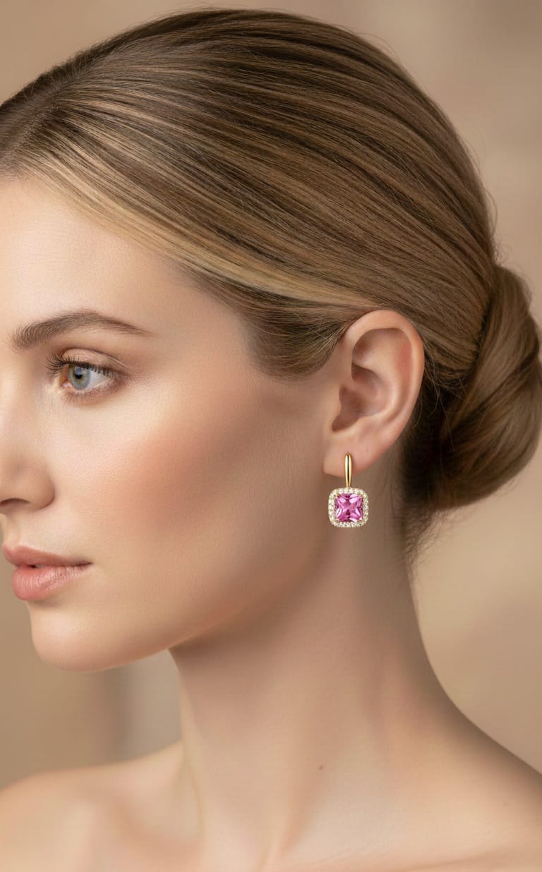 Gli Orecchini Caslano sono un inno alla femminilità e al prestigio assoluto. Realizzati in Oro Laminato 14K, questi orecchini a fascia larga si distinguono per un’intricata lavorazione a nido d’ape che esalta la brillantezza del pavé di cristalli. Il vero protagonista è la maestosa pietra centrale a taglio rettangolare in una tonalità rosa intenso, che conferisce uno “status” di lusso e una luce inconfondibile a chi li indossa.