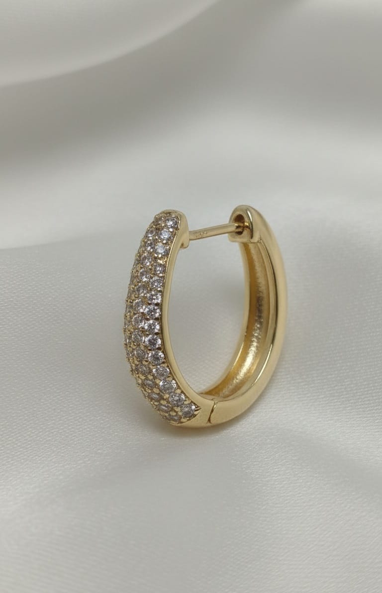 Cattura ogni sguardo con gli Orecchini Porza, un gioiello che fonde armoniosamente forme organiche e brillantezza senza tempo. Questi cerchi bombati in oro laminato 14K si distinguono per la loro silhouette a goccia allungata, che accarezza il volto con una luce sofisticata. La superficie esterna è interamente rivestita da un denso pavé di zirconi bianchi, creando un effetto di rifrazione continua che eleva il tuo status in ogni occasione, dalle cerimonie più esclusive ai momenti più preziosi della quotidianità.