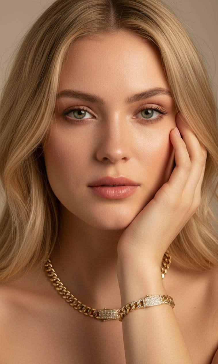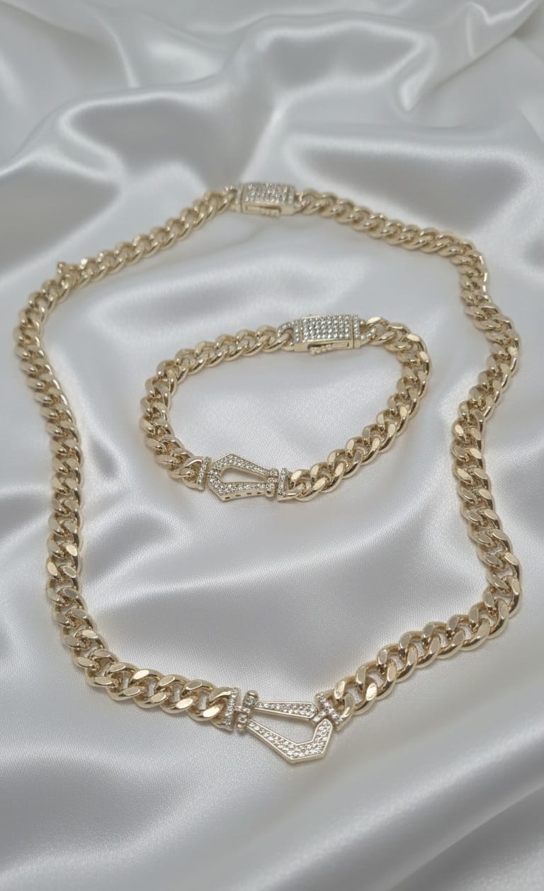 Il Set Gala è l’espressione massima della raffinatezza contemporanea. Questa parure coordinata reinventa la classica maglia gourmette (Grumetta) integrando un elemento centrale dal design audace e traforato, impreziosito da un pavé di zirconi brillanti. Realizzato in oro laminado de alta calidad de uso diario, questo set è stato progettato per chi desidera un look di lusso senza rinunciare alla resistenza. La lucentezza dell’oro si sposa perfettamente con il riflesso delle pietre, rendendolo l’accessorio ideale per eventi speciali o per distinguersi nel quotidiano.